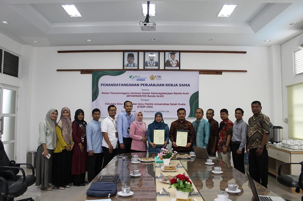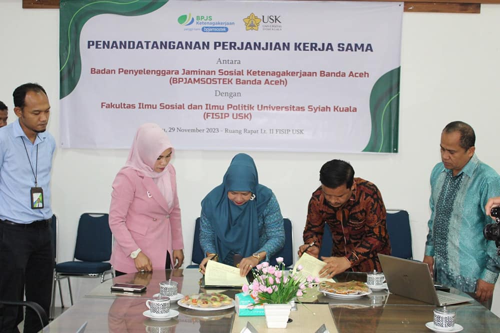 Fakultas Ilmu Sosial dan Ilmu Politik Universitas Syiah Kuala (FISIP USK) melakukan penguatan kerjasama dengan BPJS Ketenagakerjaan Banda Aceh atau BPJAMSOSTEK Banda Aceh dalam Bidang Pendidikan, Penelitian, Pengembangan Ilmu Pengetahuan Dan Teknologi Serta Pengembangan Sumber Daya Manusia. Penguatan Kerjasama ini ditandai dengan penendatanganan naskah perjanjian Kerjasama antara Dekan FISIP USK dengan Kepala BPJAMSOSTEK Banda Aceh, Syarifah Wan Fatimah pada Rabu, 29 November 2023 di FISIP USK, Darussalam, Banda Aceh.